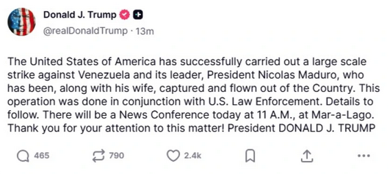 «Οι Ηνωμένες Πολιτείες της Αμερικής πραγματοποίησαν με επιτυχία μια μεγάλης κλίμακας επίθεση εναντίον της Βενεζουέλας και του ηγέτη της, Προέδρου Νικολάς Μαδούρο, ο οποίος, μαζί με τη σύζυγό του, συνελήφθη και μεταφέρθηκε αεροπορικώς εκτός της χώρας. Η επιχείρηση αυτή πραγματοποιήθηκε σε συνεργασία με τις αμερικανικές αρχές επιβολής του νόμου. Λεπτομέρειες θα ακολουθήσουν. Σήμερα στις 11 π.μ. θα πραγματοποιηθεί συνέντευξη Τύπου στο Mar-a-Lago. Σας ευχαριστούμε για την προσοχή σας σε αυτό το θέμα!» ανέφερε σε ανάρτηση του στο Truth Social ο Ντόναλντ Τραμπ. Η συνέντευξη Τύπου είναι στις 18:00 ώρα Ελλάδας.