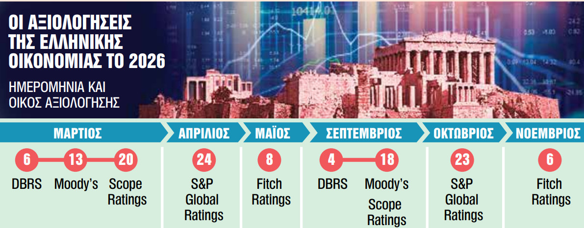 Δέκα ραντεβού με τους διεθνείς οίκους αξιολόγησης έχει μπροστά της η ελληνική οικονομία το 2026, τα οποία αναμένεται να καθορίσουν το επόμενο βήμα της χώρας εντός της επενδυτικής βαθμίδας.