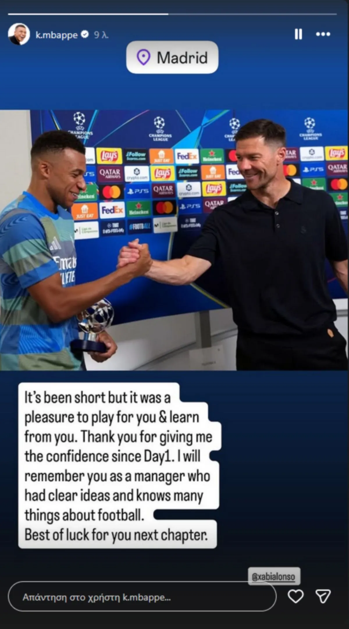 «Ήταν σύντομο το διάστημα αλλά ήταν ευχαρίστηση να παίζω για σένα και να μαθαίνω από σένα. Σε ευχαριστώ που μου έδειξες εμπιστοσύνη από την πρώτη μέρα. Θα σε θυμάμαι ως έναν προπονητή που είχε ξεκάθαρες ιδέες και ο οποίος ξέρει πολλά πράγματα για το ποδόσφαιρο. Την καλύτερη τύχη για το νέο σου κεφάλαιο».
