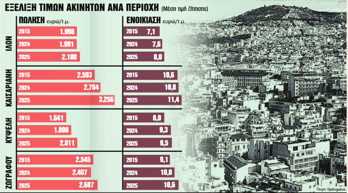 Στην ενοικίαση κατοικίας, οι περιοχές που κατέγραψαν τις μεγαλύτερες ετήσιες αυξήσεις κατά το τελευταίο τρίμηνο του 2025 ήταν μεταξύ άλλων το Πέραμα (19,4%), το Ιλιον και το Χαϊδάρι, με αυξήσεις λίγο άνω του 13%.