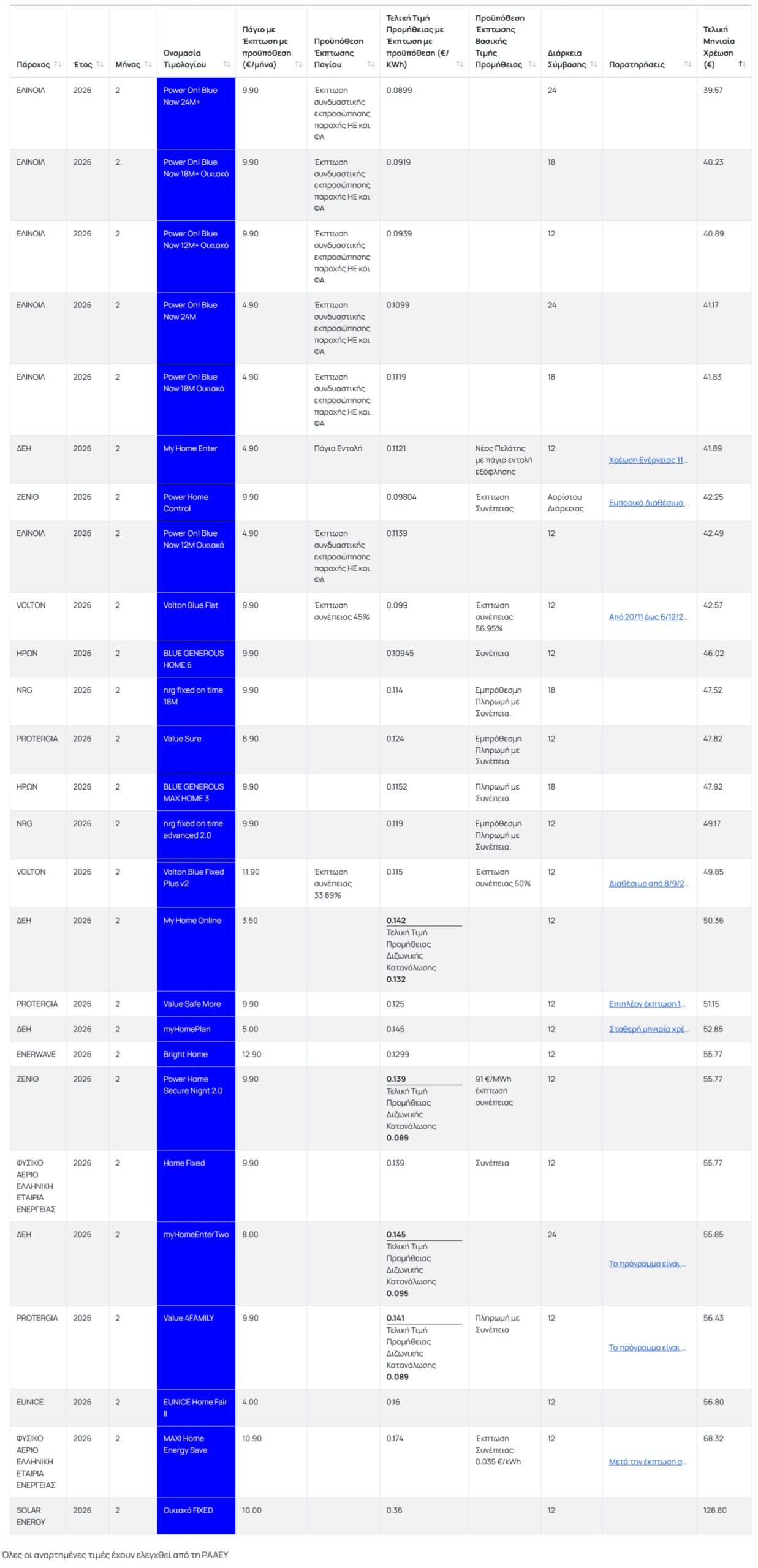 Σύμφωνα με την ιστοσελίδα της ΡΑΑΕΥ, εκ πρώτης όψεως προκύπτει ότι το εύρος στα μπλε τιμολόγια ρεύματος δεν έχει αλλάξει σημαντικά και κυμαίνεται από τα 8,99 έως τα 36 λεπτά ανά κιλοβατώρα.
