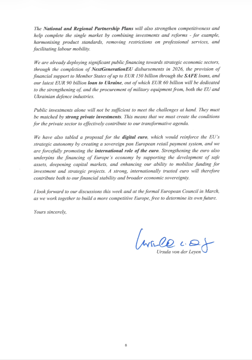 Σήμερα, η πρόεδρος της Ευρωπαϊκής Επιτροπής Ούρσουλα φον ντερ Λάιεν απευθύνθηκε με εκτενή επιστολή προς τους ηγέτες των κρατών‑μελών, ενόψει της άτυπης συνάντησης κορυφής στις 12 Φεβρουαρίου και του Ευρωπαϊκού Συμβουλίου του Μαρτίου, θέτοντας ως κεντρικό θέμα την «ανταγωνιστικότητα της Ευρώπης» και τη σύνδεσή της με τη στρατηγική αυτονομία της Ένωσης.