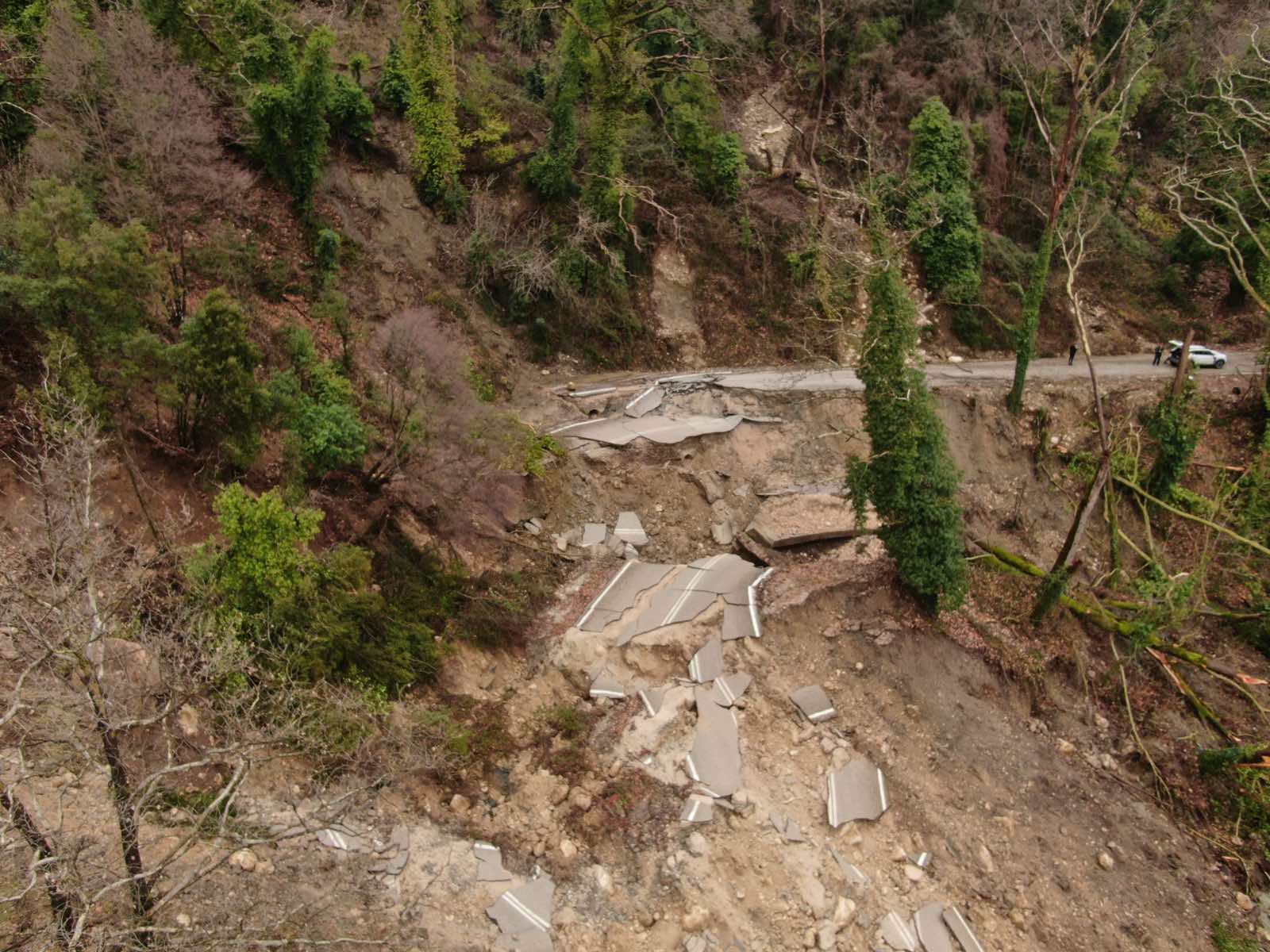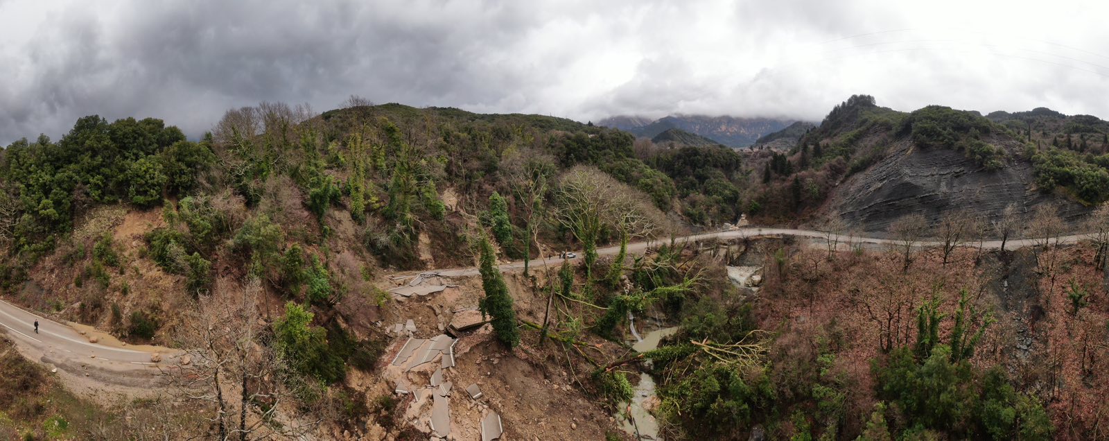 Εικόνες εκτεταμένης καταστροφής καταγράφονται στο οδικό δίκτυο των Τζουμέρκων, όπου μεγάλο τμήμα της 2ης επαρχιακής οδού υποχώρησε, παρασύροντας το οδόστρωμα σε χαράδρα δίπλα σε ρέμα της περιοχής. Η ζημιά εκτείνεται σε μήκος άνω των πενήντα μέτρων, με την άσφαλτο να έχει σπάσει σε μεγάλα κομμάτια και να έχει καταλήξει σε χαμηλότερο επίπεδο μαζί με χωμάτινους όγκους και βλάστηση.