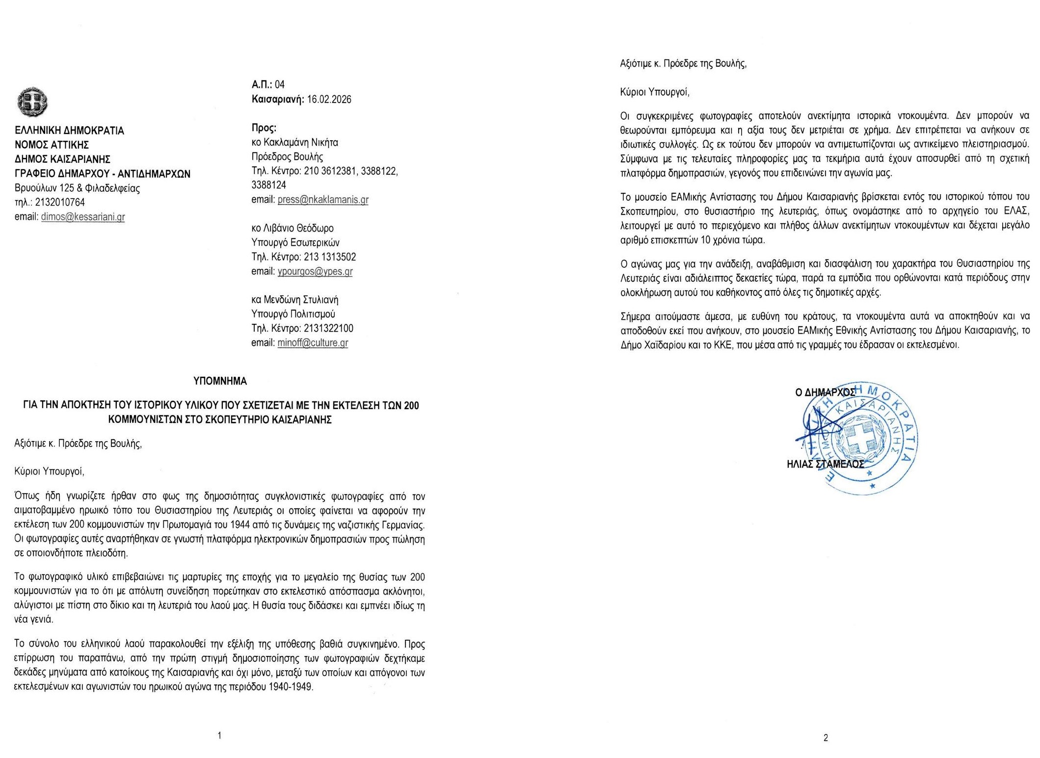 O Δήμος Καισαριανής – Υπόμνημα στη Βουλή και τα Υπουργεία Εσωτερικών και Πολιτισμού