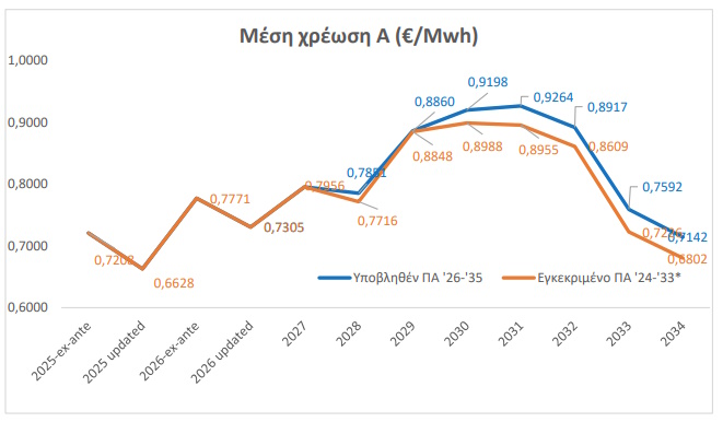 Και στις δύο περιπτώσεις, προκύπτει μια αύξηση σε σχέση με το προηγούμενο πρόγραμμα, με αντίστοιχη διακύμανση στα επόμενα δέκα χρόνια. Συγκεκριμένα, οι χρεώσεις προβλέπεται να κορυφωθούν κατά την περίοδο από το 2028 ως το 2032.