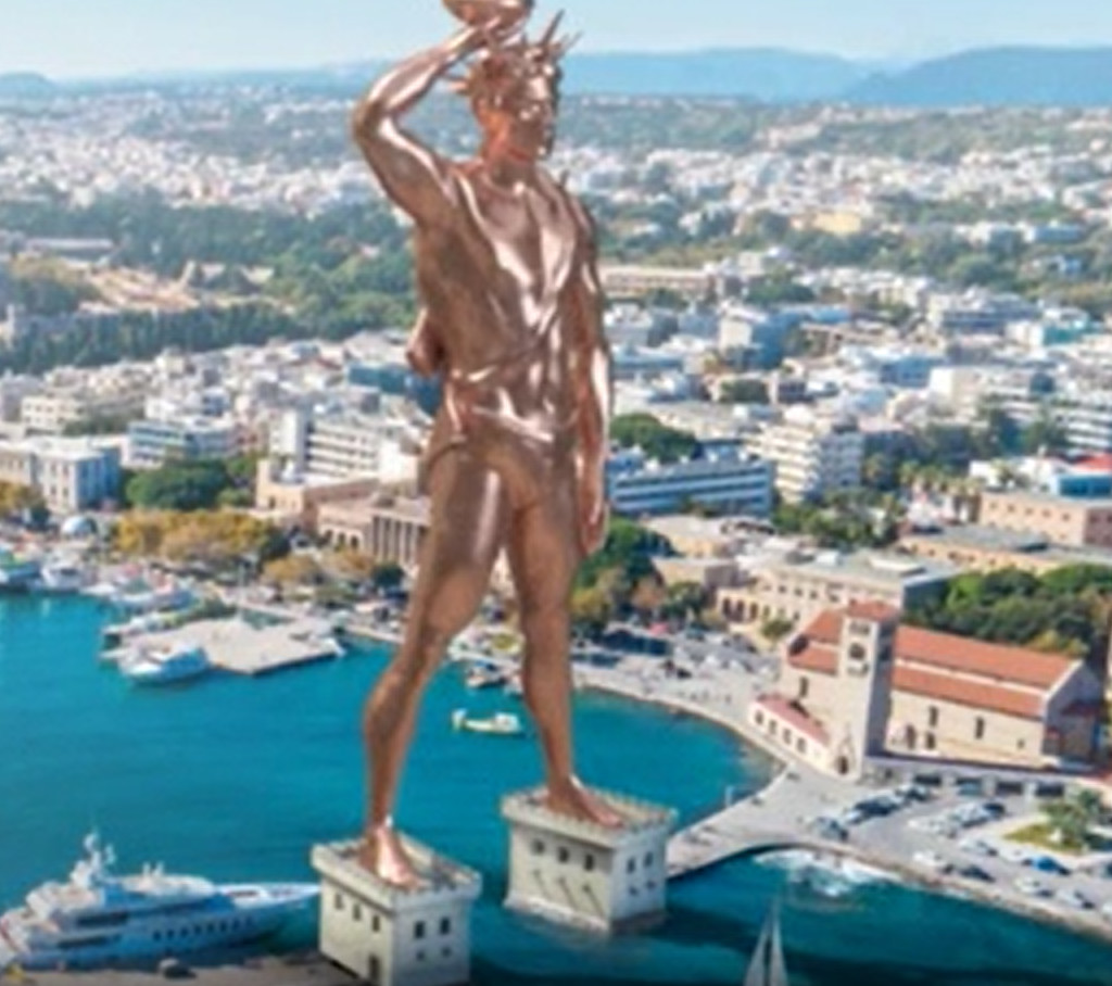 Το άγαλμα του θεού ήλιο ύψους 32 μέτρων στο λιμάνι Μανδράκι της Ρόδου υποδεχόταν τους επισκέπτες. Οι δύο μαρμάρινες βάσεις που στήριζαν τα πόδια του αγάλματος επέτρεπαν στα πλοία να μπαίνουν στο λιμάνι. Δυστυχώς παρέμεινε στη θέση του για λιγότερο από έναν αιώνα και καταστράφηκε από σεισμό.