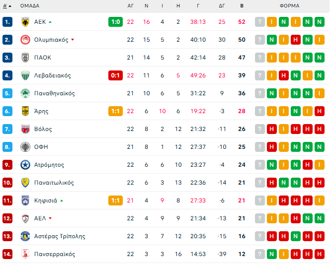 Πλέον, τα βλέμματα στρέφονται στην Allwyn Arena, όπου η ΑΕΚ υποδέχεται τον Λεβαδειακό. Με νίκη, η «Ένωση» θα αποσπαστεί μόνη πρώτη στην κορυφή της βαθμολογίας, αφήνοντας πίσω της τους συνδιεκδικητές της. Καθώς η κανονική διάρκεια του πρωταθλήματος πλησιάζει στο τέλος της, το πρόγραμμα των επόμενων αγωνιστικών αναμένεται να καθορίσει τις ισορροπίες με τις οποίες οι ομάδες θα μπουν στην τελική ευθεία των playoffs.