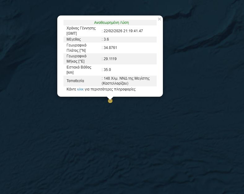 Σύμφωνα με την Αναθεωρημένη Λύση του Γεωδυναμικού Ινστιτούτου Αθηνών το επίκεντρο του σεισμού εντοπίστηκε 145 χιλιόμετρα ΝΝΔ της Μεγίστης Καστελόριζου και είχε εστιακό βάθος 35Χλμ.