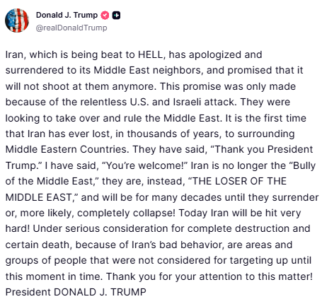 Στο μήνυμά του, ο πρόεδρος των ΗΠΑ ανέφερε πως το Ιράν «έχει απολογηθεί και παραδοθεί στους γείτονές του στη Μέση Ανατολή», δεσμευόμενο ότι δεν θα επιτεθεί ξανά εναντίον τους. Όπως σημείωσε, η εξέλιξη αυτή ήρθε ως αποτέλεσμα της «αμείλικτης επίθεσης των Ηνωμένων Πολιτειών και του Ισραήλ».